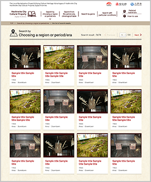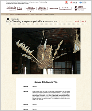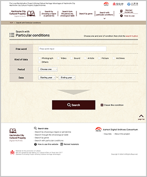 Cultural property data can be searched by combining one and over condition such as free word, kind of data, era and years.